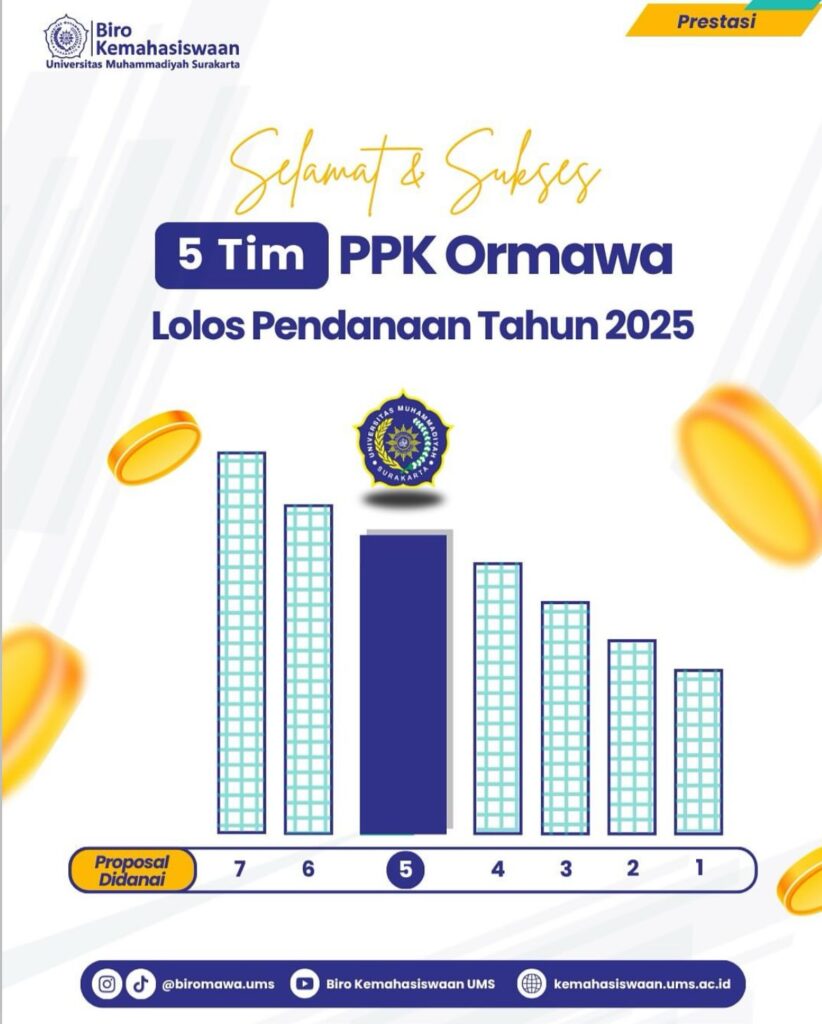 Edukreatif.id, SURAKARTA – Universitas Muhammadiyah Surakarta (UMS) kembali mencetak prestasi membanggakan di tingkat nasional. Sebanyak lima tim dari organisasi mahasiswa (Ormawa) UMS berhasil lolos pendanaan Program Penguatan Kapasitas Organisasi Kemahasiswaan (PPK Ormawa) tahun 2025 yang diselenggarakan oleh Direktorat Pembelajaran dan Kemahasiswaan (Belmawa) Kemendiktisaintek.